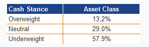 Cash positioning in the full sample: 13.2% OW, 29.0% Neutral, 57.9% UW