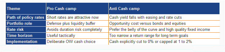 The pro cash case is about function. Cash is a shock absorber and keeps optionality alive when markets dislocate. With elevated short term rates, cash can feel like a rare “risk free” return stream, especially for allocators who want to avoid the volatility of longer duration bonds. Cash can also be framed as readiness: liquidity to seize opportunities when markets dislocate, rather than a strategic end state. In that view, Overweight Cash is not doing nothing, it is buying flexibility while still earning carry.