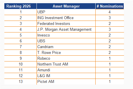 With four nominations across the five categories, UBP enters the final stage of the awards with the strongest position. Several other firms remain close behind, particularly ING Investment Office and J.P. Morgan Asset Management.