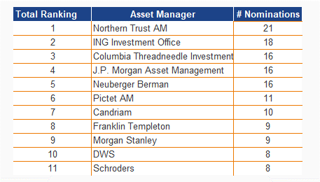 UBP leads this year’s shortlist with four nominations, appearing in almost every category. ING Investment Office and J.P. Morgan Asset Management follow with three nominations each.