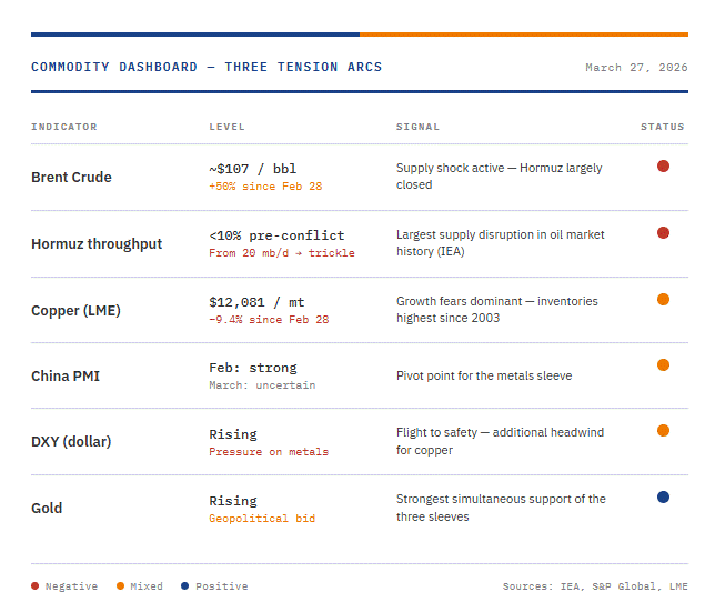Until Hormuz closed, the commodity story ran on two axes: dollar direction and Chinese growth momentum. A third arc has now emerged that overshadows both, for as long as the strait remains closed.