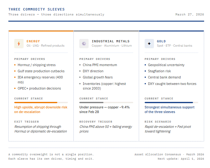 The gold sleeve has the strongest simultaneous support: geopolitical uncertainty, stagflation risk, central bank demand, and a dollar caught between two forces. Gold is currently the most coherent position within the commodity basket.