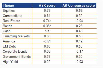 *ASR score based on Real Assets beat Treasuries and Treasuries beat Cash respectively. Scale runs from -1.00 to +1.00: above +0.20 overweight, below -0.20 underweight, in between neutral.